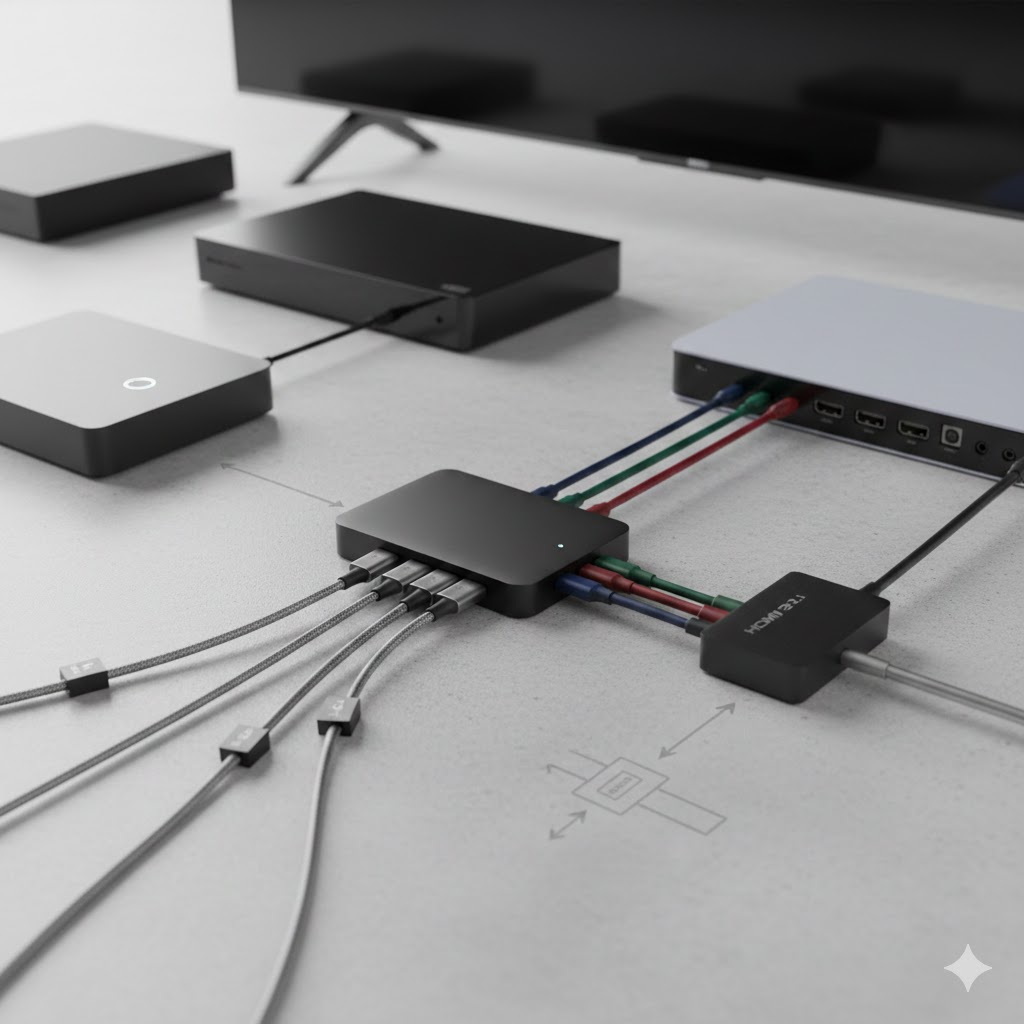 - 기능: 여러 개의 HDMI 입력 신호를 받아서 그중 하나를 선택해 하나의 HDMI 출력 기기(TV)로 전환해서 보여줘요.