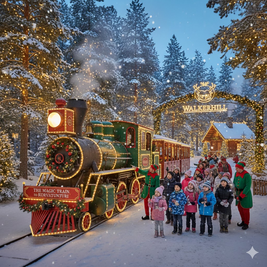 2025년 산타 키즈 빌리지의 테마는 더 매직 트레인으로, 아이들이 산타의 패스포트(매직 여권)를 발급받고 마법 기차를 타고 코르바툰투리(핀란드 산타의 비밀 숲)로 떠나는 모험 콘셉트예요.