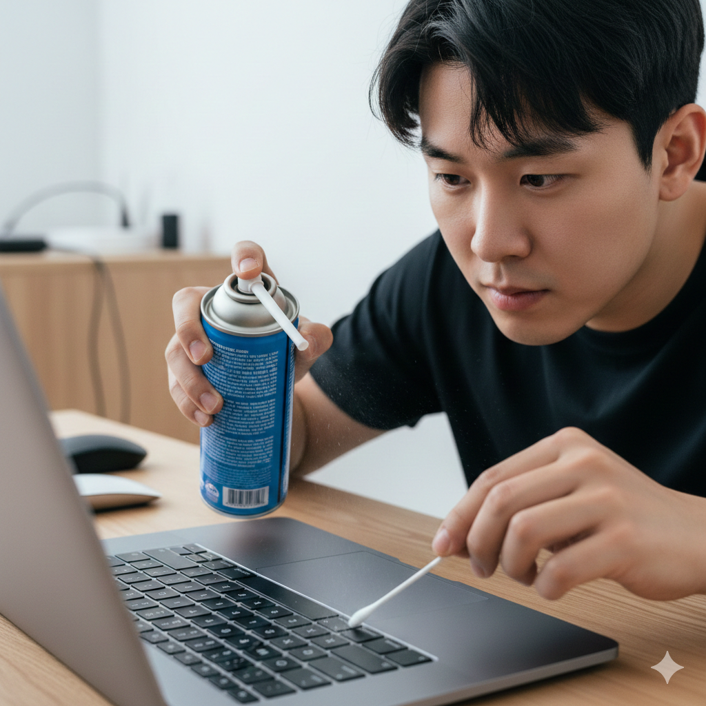 저는 맥북의 알루미늄 본체에 손상을 주지 않으면서 키감만 회복하는 방법을 선호해요. 압축 공기 캔을 사용할 때는 노즐을 키보드에서 1센티미터 정도 띄우고 75도 각도로 기울여서 분사해야 해요. 너무 가까이서 쏘면 액체 질소가 나와서 부품이 냉해를 입을 수 있으니 주의가 필요해요.