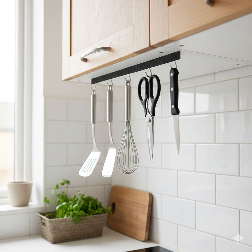 금속 도구들이 일렬로 나란히 걸려 있는 모습은 인테리어 측면에서도 아주 깔끔한 인상을 줘요. 마치 전문 셰프의 주방 같은 세련된 분위기를 연출할 수 있고, 무엇보다 서랍을 뒤적거릴 필요가 없다는 점이 주는 쾌적함이 엄청나요. 1,000원으로 누리는 이 사소한 변화가 매일 반복되는 주방 노동의 질을 높여주는 셈이에요.
