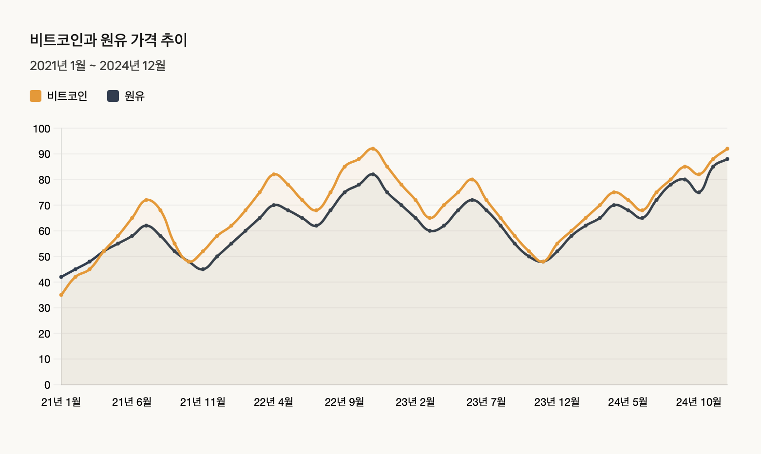 비트코인이 가진 매력은 그 정체성이 확정되지 않았다는 점에 있어요. 만약 비트코인이 완벽하게 금의 역할만 했다면 지금 같은 폭발적인 수익률은 불가능했을 거예요. 하지만 위험 자산의 성격도 함께 가지고 있어서 유동성이 풍부할 때 엄청나게 오를 수 있는 거에요. 원유 가격과의 상관관계는 바로 이런 비트코인의 두 얼굴을 보여주는 거울과 같아요.