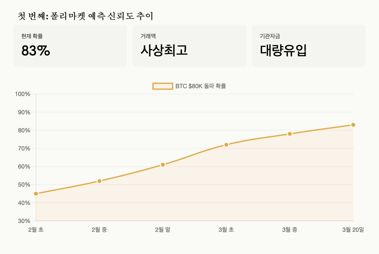 비트코인이 심리적 마지노선인 8만 달러를 돌파할 확률이 폴리마켓에서 83%를 넘어서며 시장이 들썩이고 있어요. 예측 시장의 집단지성은 단순한 추측을 넘어 실제 거대 자본의 움직임을 아주 예민하게 포착해내고 있어요. 저는 최근 시장의 흐름을 보면서 비트코인이 단순한 투기 수단을 넘어 전 세계 금융의 중심축으로 이동하고 있다는 사실을 강하게 느끼고 있어요.
